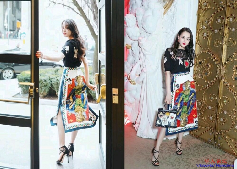 迪丽热巴身穿印花半身裙出席D&G秀场,开衩的设计将其妩媚的女性气息表现得淋漓尽致