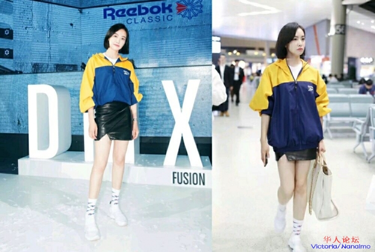 宋茜这身撞色运动外套混搭黑色皮裙,短款的开衩裙更能展现身材,搭配一双小白鞋,休闲中带有一点小性感