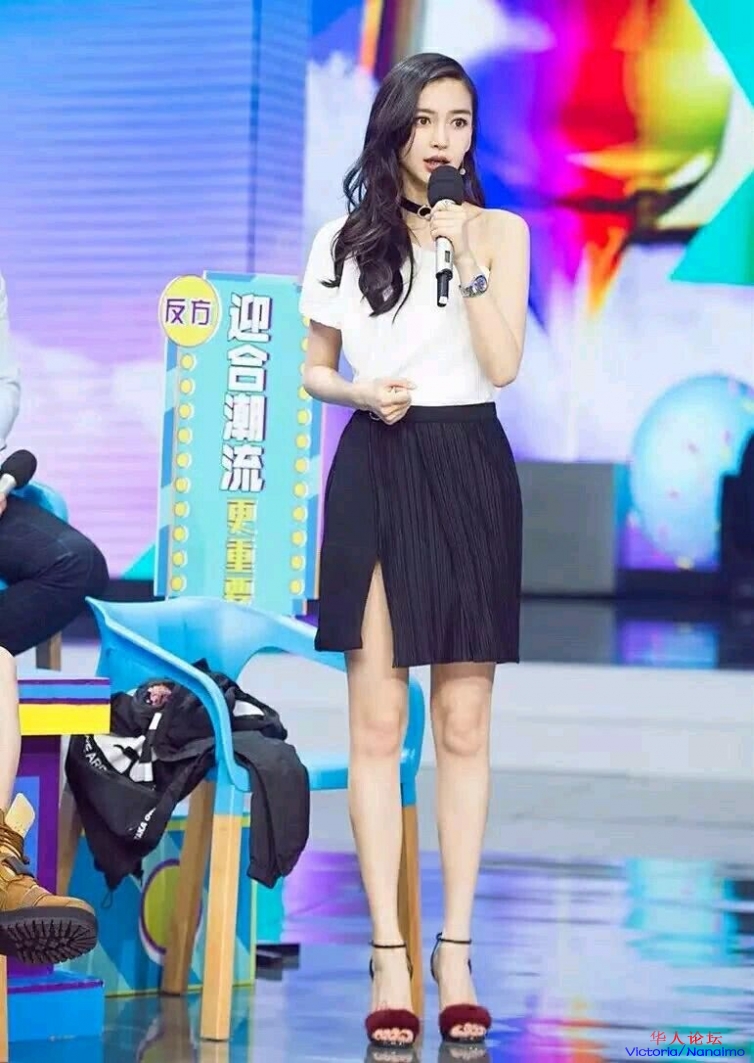 Anglebaby身穿高腰开叉短裙搭配白色斜肩上衣,裙子的开衩和褶边的结合设计感十足,简单的黑白配也让人感到十足的时髦~