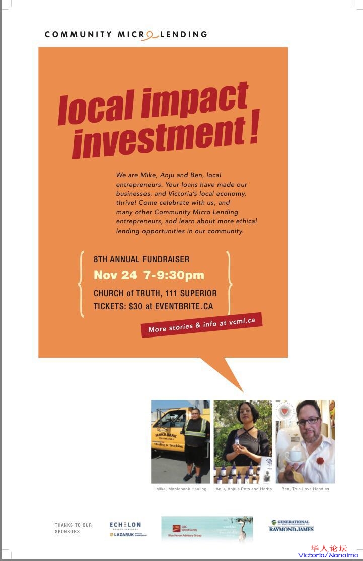 2017年度VCMLS慈善拍卖晚会Victoria Community Micro-Lending Annual Fundraiser, 将于11月24日在Church of Truth(渔人码头附近)举办,感谢我们的捐助方,照亮我们的企业家,为我们的组织筹集资金。我们也很高兴能与客座发言人希瑟·哈奇吉安一起来强调投资的影响。她是目标资本(一家投资影响咨询公司)的高级顾问,也是卡尔顿社区创新中心的研究人员。晚会将提供清淡的开胃菜,现金酒吧和各类拍卖物品。- O' R m7 A' E: t5 L, Z: T