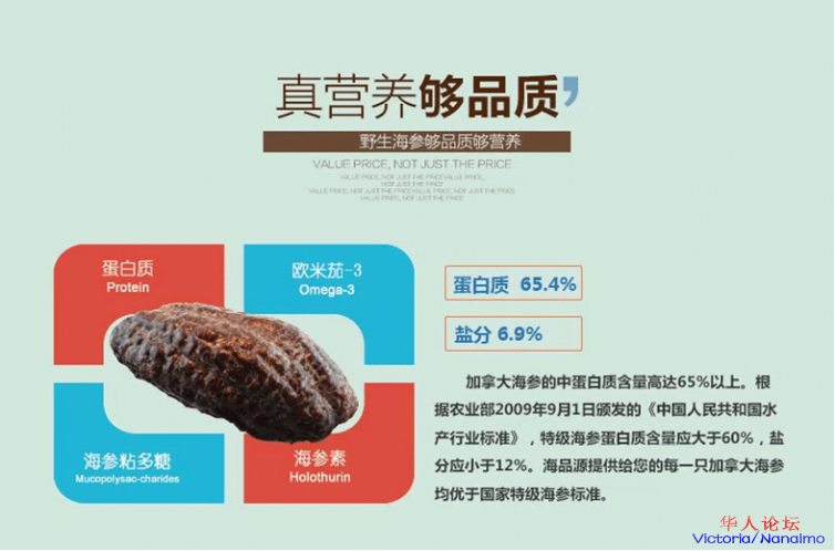 加拿大海参,牠是一种名贵海产动物,生活于北极大西洋水域大约50英呎深的冷水中,该水域水温低于摄氏13°C,冬季水面结冰,终年人迹罕至并无污染的环境下生长8年。故营养价值非常高,专家曾检测北美刺参营养价值高于日本海