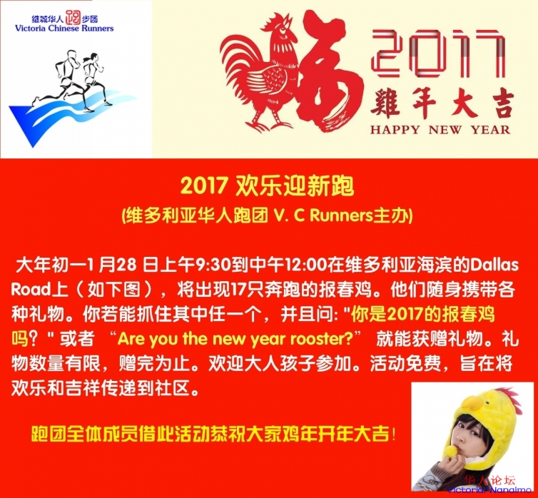 6 A0 c) i( A, Y" {. J$ Q1 f辞猴迎鸡,我们从活动筹备之初就得到了新春的祝福——维多利亚资深华人房产经纪Winnie Wu (2504809908)、Peterson 装修公司(7789225005)和维多利亚华人接待服务中心(微信pscc20150801)提供的赞助。本次活动完全免费,欢迎大家踊跃参加! 17位带着2017鸡年祝愿的报春鸡志愿者已经准备就绪,就等着你们来抓住他们,并说出鸡年的吉祥语:“你是2017的报春鸡吗?”一起来,追逐报春鸡,迎接新春到来吧!