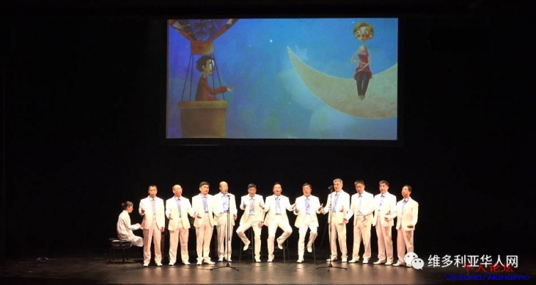 男生小合唱由维多利亚中华艺术团带来的男生小合唱演唱了大家熟悉的四川民歌《康定情歌》和印尼民歌《哎哟,妈妈》。6 H& J$ ^4 m& {2 K$ J. {