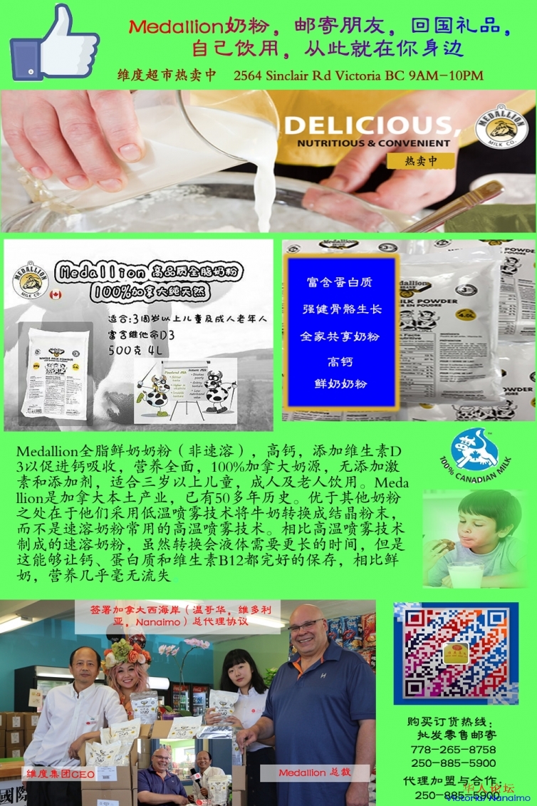 为庆祝维度集团旗下的维度超市成为Medallion奶粉加拿大西海岸的独家代理,从今天起,进行奶粉大促销,买一箱(12包),送一包,买两箱,送三包活动。大家快快行动吧,热卖就在维度超市。