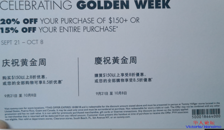 庆祝黄金周-9.21-10.8 Tommy Hilfiger 折上85折,满150,折上8折, 有需要的自取图片啦,连coupon 都是中文的,好会做生意