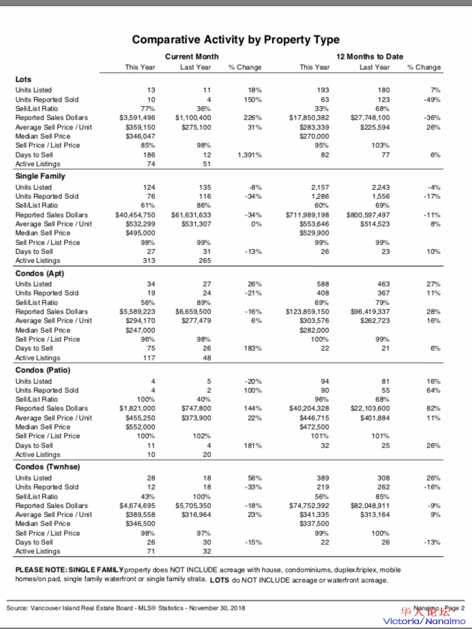 根据温哥华岛地产局最新发布的2018年11月份房地产成交数据,2018年11月份独立屋共成交76套,均价为53.2万。这个数字与今年10月份相比,均价环比下降4.8%,成交量下降37%(10月独立屋成交121套,均价55.9万)。与去年同期相比,价格同比持平,而交易量则下降34%。11月份库存房源为313套,10月份的独立屋存量房源为335套,这主要因为季节原因,11月份纳奈莫进入冬季,挂牌量减少。独立屋今年11月份的议价空间平均为2%,而今年10月份的议价空间为3%。