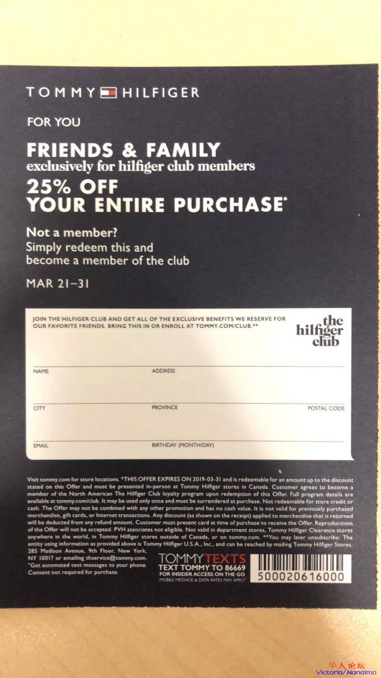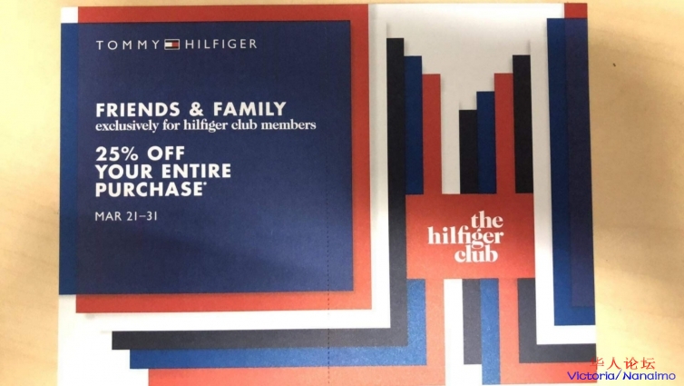 tommy Hilfiger 一年只有两次的family and friends 大折扣来了!全场折扣基础上 再75折!没有最低消费,就算只花十刀也能打折。 错过可能就要到年底咯,换季买衣服的最佳时期,大家不要错过啦,出示图片有效啦!!!~~~3.21-3.31~~~~ 维多利亚millstream village 店哦,近costco. 地址: 2401 a millstream rd