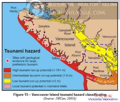 夏夏:Nanaimo位于温哥华岛靠近大陆的一侧,所以发生海啸的可能极低。Nanaimo历史上没有关于海啸的记载,按照专家分析,即使太平洋发生海啸,Nanaimo最多也就是起2米浪。这个情况和温哥华是一样的,维多利亚就没有如此幸运了。(官方分析见下图)